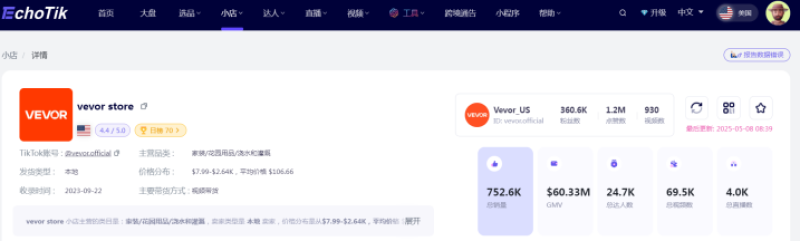 VEVOR的銷售數(shù)據(jù)十分可觀 圖源:Echotik