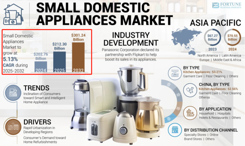 從市場規模來看,全球小家電市場呈現出穩健增長的態勢。隨著全球經濟的持續發展以及消費者生活水平的不斷提高,人們對生活品質的追求日益提升,小家電作為能夠有效提升生活便利性和舒適度的產品,受到了越來越多消費者的青睞。根據Fortune Business Insights的數據,2024年,全球小家電市場規模達2027.6億美元,預計到2032年,該市場規模將從2025年的2123億美元增長至3012.4億美元,預測期內復合年增長率為5.13%。