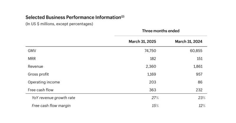 詳細(xì)來看,在今年一季度,Shopify營(yíng)收為23.6億美元,同比增長(zhǎng)27%;毛利潤(rùn)達(dá)11.7億美元,去年同期為9.6億美元;GMV達(dá)747.5億美元,較去年同期的608.5億美元上漲不少;自由現(xiàn)金流為3.6億美元,利潤(rùn)率為15%。