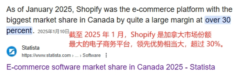 據(jù)了解,Shopify幾乎可以說是加拿大電商市場(chǎng)的首選軟件解決方案。數(shù)據(jù)顯示,截至2025年1月,Shopify以超過30%的市場(chǎng)份額占比,在加拿大市場(chǎng)遙遙領(lǐng)先。