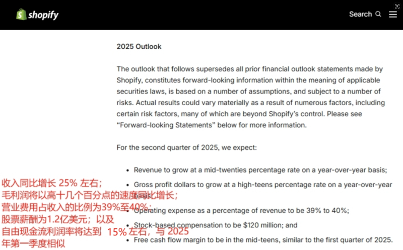 在本季度各項(xiàng)數(shù)據(jù)向好的背景下,對(duì)接下來的第二季度Shopify也有著更大的期待。Shopify預(yù)計(jì)2025年第二季度營(yíng)收入同比增長(zhǎng)25%左右,毛利潤(rùn)與去年同期相比以百分之十幾的速度增長(zhǎng),營(yíng)業(yè)費(fèi)用占收入比例為39%至40%,自由現(xiàn)金流利潤(rùn)率將在15%左右,與一季度相似。
