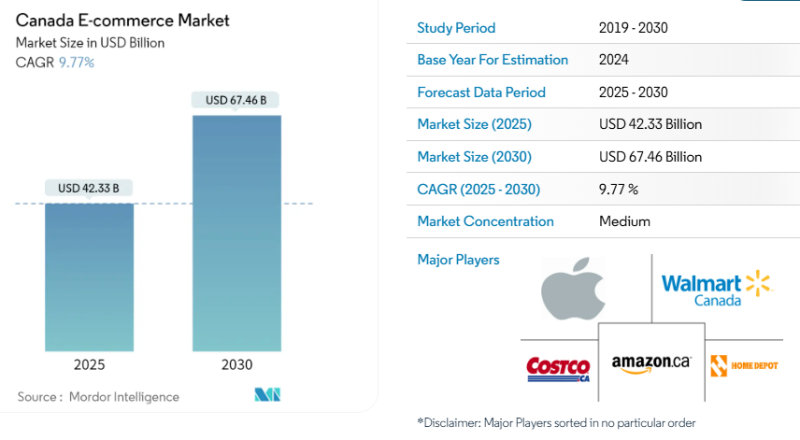 相關(guān)數(shù)據(jù)顯示,2025年加拿大電子商務(wù)市場(chǎng)規(guī)模估計(jì)為423.3億美元,預(yù)計(jì)到2030年將達(dá)到674.6億美元,在這期間的復(fù)合年增長(zhǎng)率將達(dá)到9.77%。