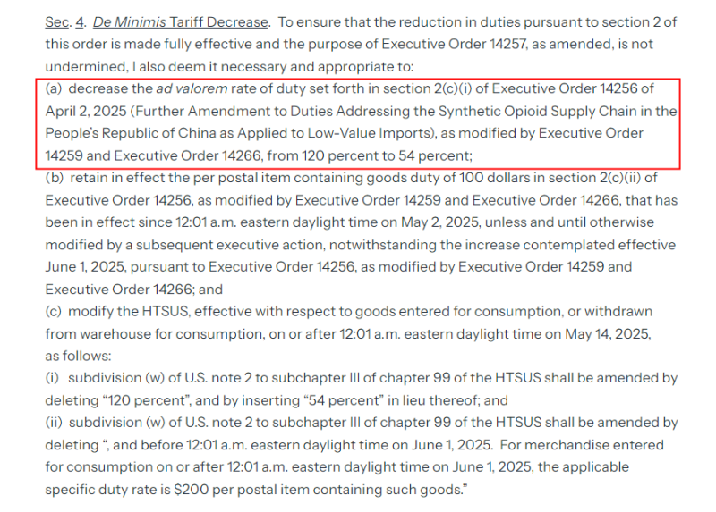 5月13日消息,白宮官網發布特朗普修正行政命令,對價值低于800美元的小額包裹關稅進行重大調整,從價關稅稅率從120%降至54%,同時維持每件100美元的從量關稅,并撤銷6月1日將從量關稅從100美元提高至200美元的計劃。以上調整適用于所有自中國大陸、中國香港及中國澳門進口進入美國關稅區、用于消費的商品,或自倉庫提取用于消費的商品。