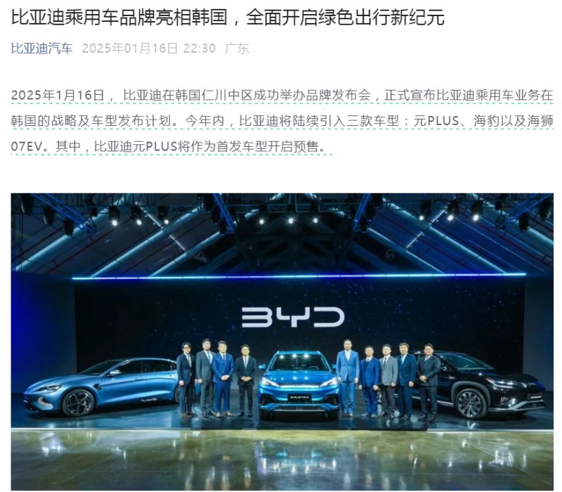 比亞迪汽車進入韓國市場?圖源:比亞迪汽車公眾號