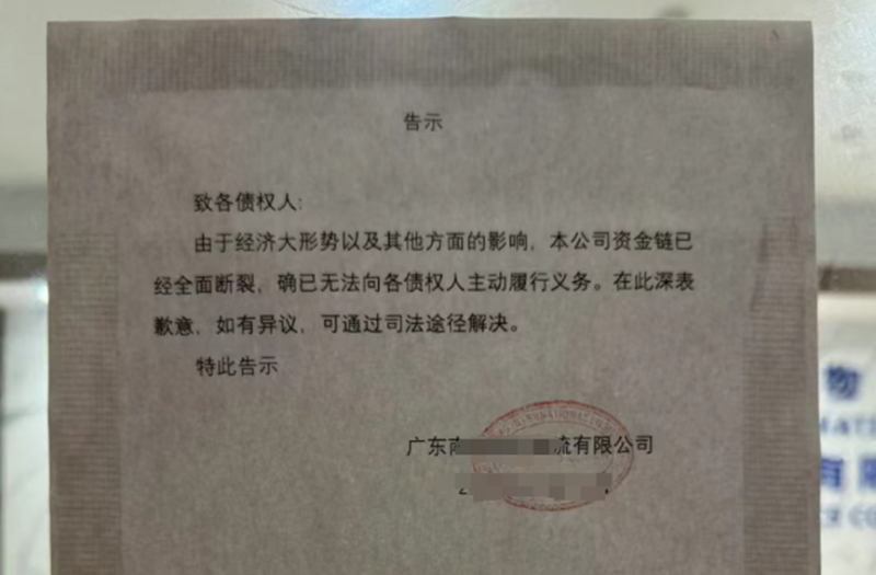 而當反應過來的供應商、貨主和賣家打算上門討債時,發現該公司早已人去樓空,只在大門口留下一封致各債權人告示:“本公司資金鏈已經全面斷裂,確已無法向各債權人主動履行義務。在此深表歉意,如有異議,可通過司法途徑解決。”