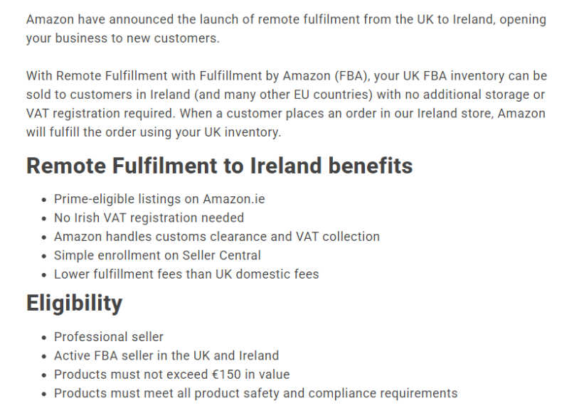 具體而言,當愛爾蘭消費者在Amazon.ie網站下單時,亞馬遜將直接從英國賣家的FBA庫存中發貨,無需賣家將庫存預先轉運至愛爾蘭。亞馬遜會負責整個清關流程并代收愛爾蘭的增值稅,簡化了賣家的合規壓力,同時節省了在愛爾蘭設立本地倉儲的運營成本。該服務還提供比英國國內配送更低的履約費用,并支持商品自動擴展至Amazon.ie,幫助賣家快速上線愛爾蘭站點商品。