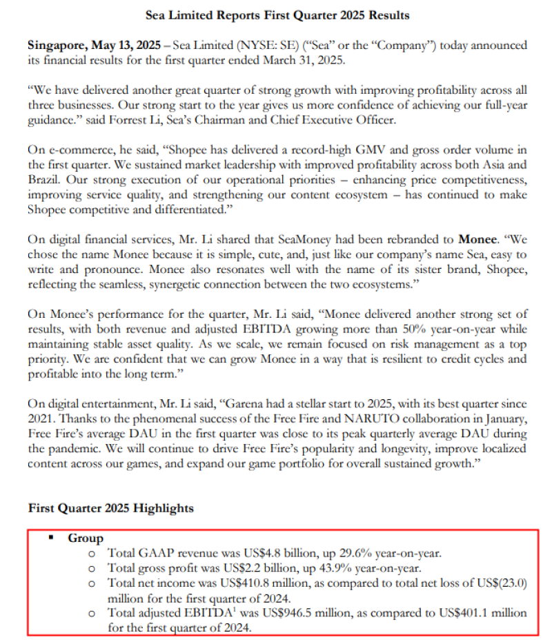 圖源:Sea 2025年第一季度財(cái)報(bào)