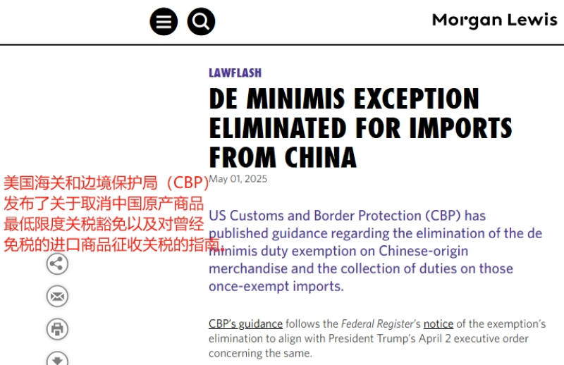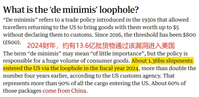 回過頭來看,本月初美國海關與邊境保護局(CBP)發布公告稱,來自中國大陸和香港地區的商品將不再適用《美國法典》第19卷第1321(a)(2)(C)條款規定的關稅及部分稅費的豁免政策,大量賣家受到影響。