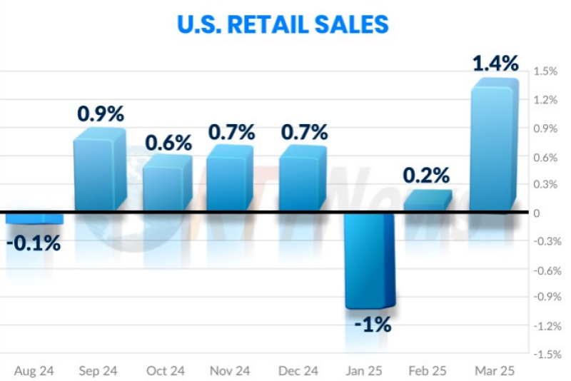 美國商務部零售報告數據顯示,今年3月美國零售額同比增長4.6%,創下自2023年1月以來的最大月度增幅。