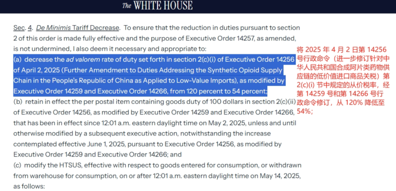 美國當地時間12日,白宮網站公布了總統特朗普的修訂版行政命令,宣布自14日起,調整對價值低于800美元小額包裹的從價關稅稅率,將對從中國進口的小件商品的關稅從120%降至54%。