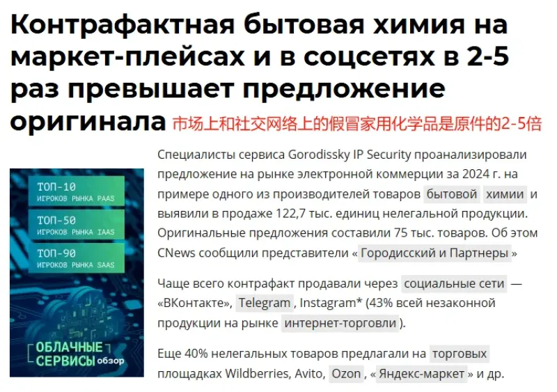 知識產(chǎn)權安全公司Gorodissky在一份報告中指出,在俄羅斯電商市場,存在大量假冒家用化學品,比如洗衣凝膠、洗發(fā)水、洗衣粉等,其數(shù)量甚至是真品的2-5倍,這些假冒產(chǎn)品主要通過VKontake、Telegram、Instagram等社交網(wǎng)絡流通。