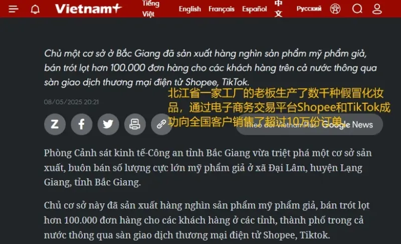 據(jù)了解,這些假貨主要通過Shopee、TikTok等電商平臺,以貨到付款的方式銷售。初步估計,該賣家非法經(jīng)營收入超60億越南盾(約合人民幣167萬元)。