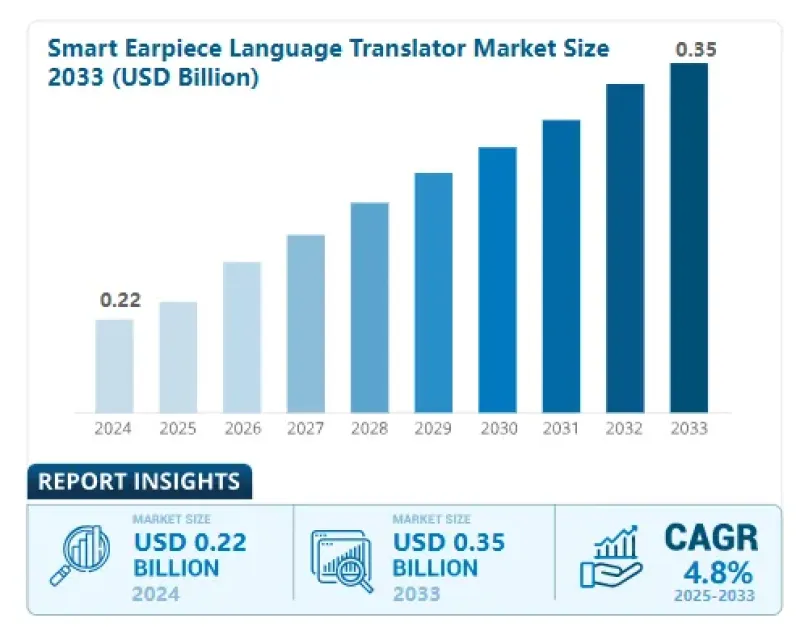 一份來(lái)自Business Research Insights的報(bào)告顯示,2024年全球智能耳機(jī)語(yǔ)言翻譯市場(chǎng)規(guī)模達(dá)到2.2億美元,預(yù)計(jì)到2033年市場(chǎng)規(guī)模將達(dá)到3.5億美元,這一期間復(fù)合年增長(zhǎng)率為4.8%,可見(jiàn)這一賽道還有很大的增長(zhǎng)空間。