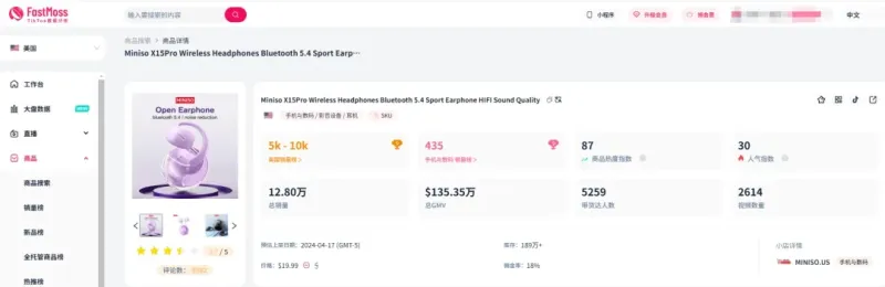 根據(jù)騎鯨出海的數(shù)據(jù),最近兩款名創(chuàng)優(yōu)品耳機(jī)在TikTok Shop西班牙站賣(mài)爆了。其中一款MINISO X15 Pro近7天賣(mài)出1127件,銷(xiāo)售額達(dá)到1.13萬(wàn)歐元(約合人民幣9萬(wàn)元),產(chǎn)品總銷(xiāo)量達(dá)到8446件,銷(xiāo)售總額為10.95萬(wàn)歐元(約合人民幣88萬(wàn)元)。