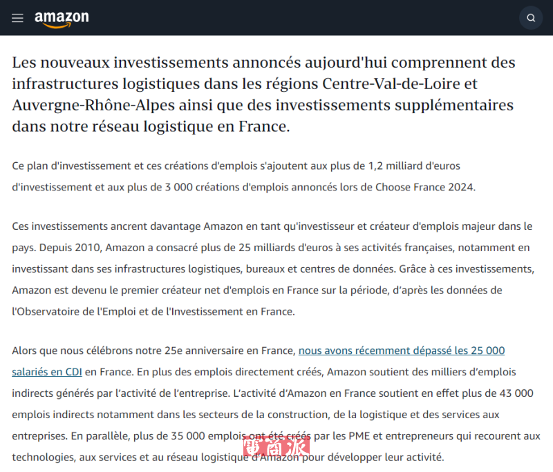 這項新計劃是在亞馬遜于2024年“選擇法國”活動中宣布投資超過12億歐元和創造3000多個工作崗位的基礎上作出的延伸。自2010年以來,亞馬遜在法國的總投資已超過250億歐元,涵蓋物流基礎設施、辦公場所及數據中心建設。根據法國就業與投資觀察站的數據,這些投入使亞馬遜成為自2010年以來法國凈新增就業崗位最多的企業。