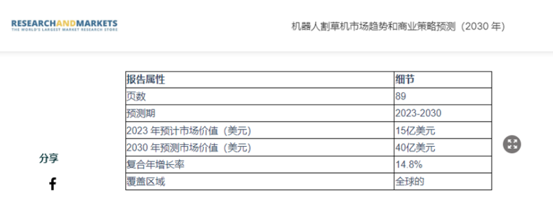 Research And Markets發布的《機器人割草機——全球戰略業務報告》就指出,隨著消費者對自動化家居解決方案需求的不斷增長、傳感器技術的進步以及對可持續草坪護理的關注,機器人割草機市場正在加速增長。據估計,2023年全球機器人割草機市場規模為15億美元,預計到2030年將達到40億美元,2023年至2030年的復合年增長率為14.8%。