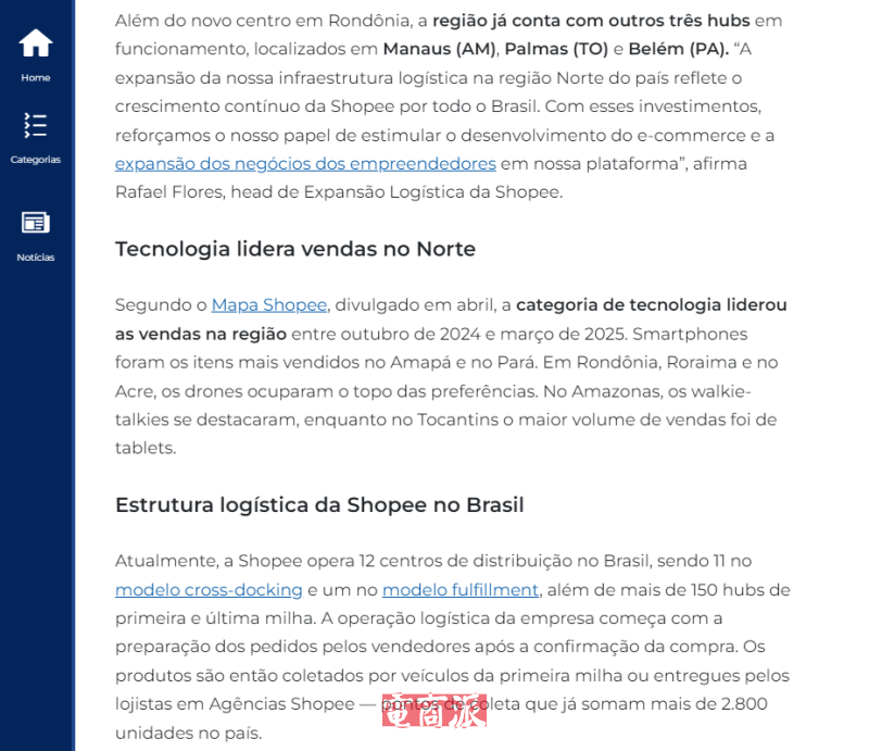 Shopee物流擴張主管Rafael Flores表示:“我們在巴西北部地區物流基礎設施的擴張反映了Shopee在巴西的持續增長。通過這些投資,我們將加強在促進電商發展和平臺創業者業務拓展方面的作用。”