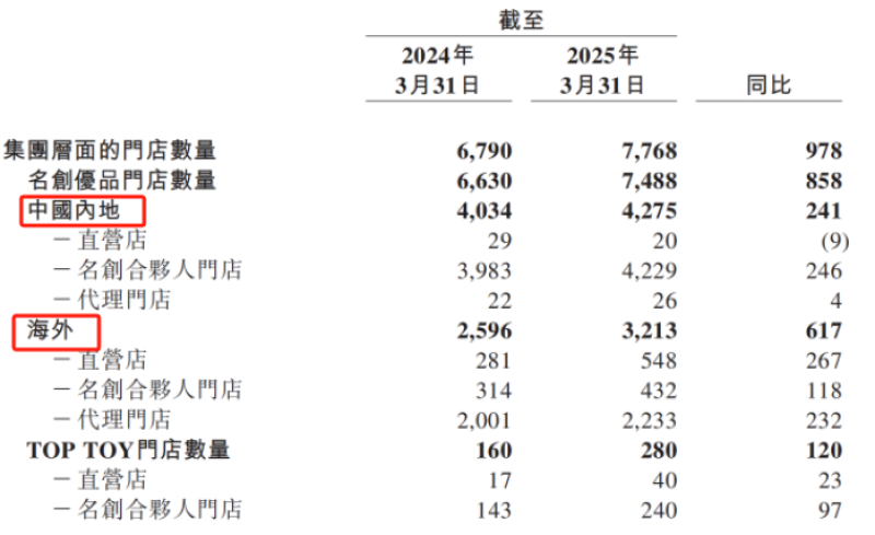 門店數量方面,截至今年3月31日,名創優品集團層面的門店總數為7768家,同比凈增978家,其中大多數新開的門店都在海外,海外門店為3213家,同比凈增617家,與國內總門店數量(4275家)也比較接近。