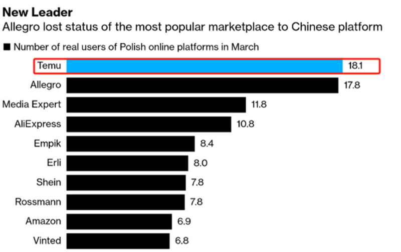 事實上,Allegro在國際市場拓展過程中并非一帆風順,也面臨著諸多挑戰。從競爭環境來看,在國際市場尤其是歐洲其他市場,早已存在亞馬遜、eBay等電商巨頭,這些巨頭占據了大量市場份額。此外,電商新秀的崛起也在沖擊著Allegro的市場地位,Gemius Mediapanel的數據顯示,截至今年3月,拼多多Temu在波蘭擁有1810萬名真實用戶,而Allegro的實際用戶數量只有1780萬。顯然,Allegro已經被反超,這是值得重視的一大方面。