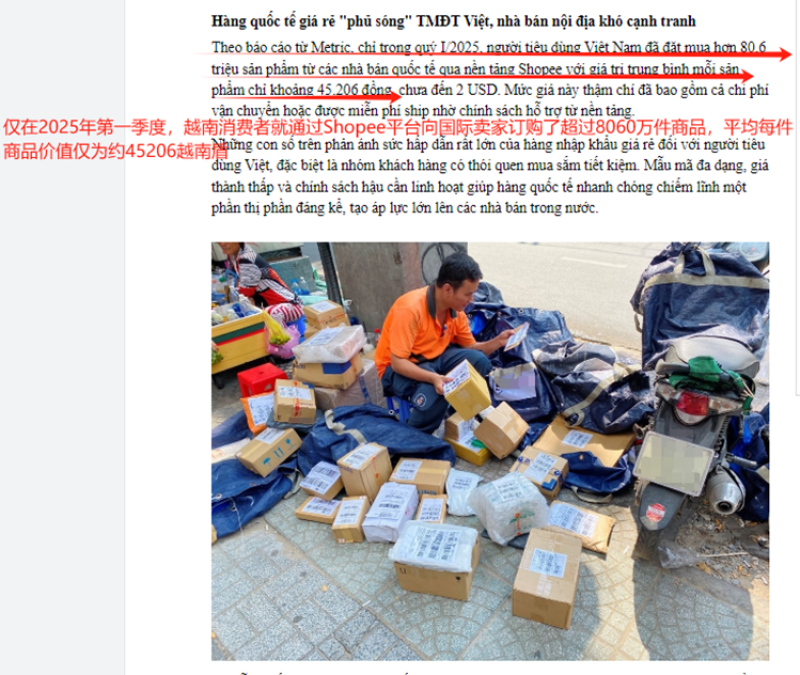 統計數據顯示,2024年,有超過3.24億件進口商品通過Shopee進入越南,平均每件產品價值僅為43682越南盾。而Metric的報告則顯示,僅2025年第一季,越南消費者就通過Shopee平臺向國際賣家訂購了超8000萬件商品,平臺每件商品價值僅不到2美元。如果采用100萬越南盾的免稅門檻,幾乎所有這些商品都無需繳納進口稅。
