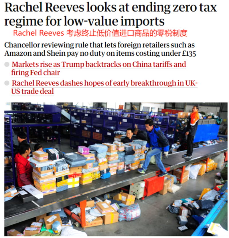 在歐盟之后,英國也表達了類似的想法。今年4月末,英國財政大臣Rachel Reeves(雷切爾·里夫斯)公開表示,由于接到許多零售商的投訴,英國相關部門正考慮終止低價值進口商品的零稅制度,旨在遏制“通過線上平臺銷售廉價商品削弱英國零售商競爭力”的現象。據統計,僅在2023年,通過免稅優惠進口到英國的商品數量飆升至10億件,貨值達到545億美元。