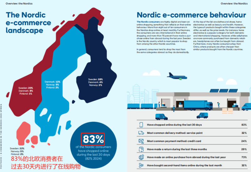 根據PostNord International發布的《2025年春季北歐電商報告》,北歐地區的跨境網購呈現出一派繁榮景象。在瑞典、挪威、丹麥和芬蘭這四個主要北歐國家,越來越多的消費者將目光投向海外,尋求更多元化、更具性價比的商品。數據指出,在過去的一個月時間里,83%的北歐消費者表示曾進行過網購,其中73%的受訪者曾從國外平臺購物。