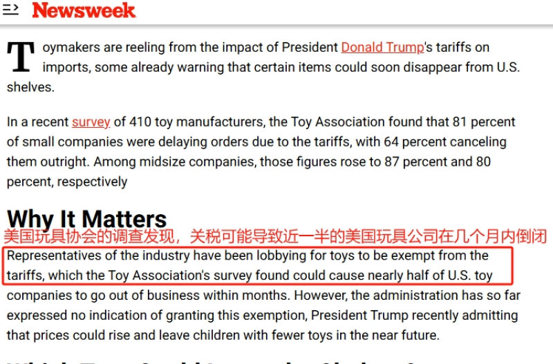 據了解,2011年成立于美國,前身是爐具制造商Solo Stove的亞馬遜頭部戶外品牌——Solo Brands由于股價持續大跌,收到了紐約證券交易所發出的退市通知。無獨有偶,在特朗普上調對華關稅之后,玩具巨頭美泰(Mattel)和孩之寶(Hasbro)股價也雙雙出現下滑。還有調查指出,受關稅的影響,可能近一半的美國玩具公司在幾個月內走向倒閉的命運。