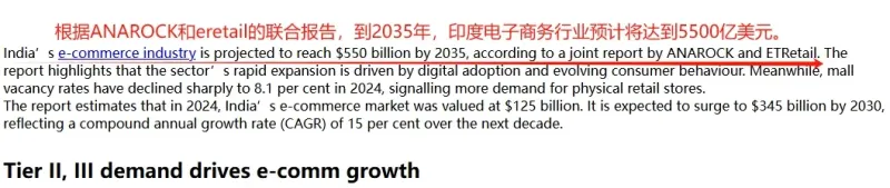 隨著當(dāng)?shù)鼗ヂ?lián)網(wǎng)普及率、智能手機(jī)滲透率不斷提升,數(shù)字支付便捷化以及物流基礎(chǔ)設(shè)施不斷完善,印度電商市場(chǎng)潛力正加速爆發(fā)。ANAROCK發(fā)布的報(bào)告顯示,2024年印度電商市場(chǎng)規(guī)模達(dá)到1250億美元,預(yù)計(jì)到2035年增至5500億美元,期間復(fù)合年增長(zhǎng)率高達(dá)15%。