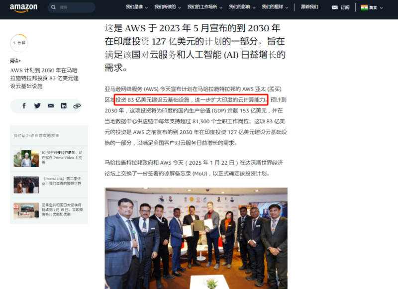 今年年初,亞馬遜AWS宣布計(jì)劃在印度馬哈拉施特拉邦投資83億美元,用于擴(kuò)展AWS亞太區(qū)域的云基礎(chǔ)設(shè)施。AWS表示,此次投資將顯著增強(qiáng)印度的云計(jì)算能力,以滿足客戶對(duì)云服務(wù)日益增長(zhǎng)的需求。