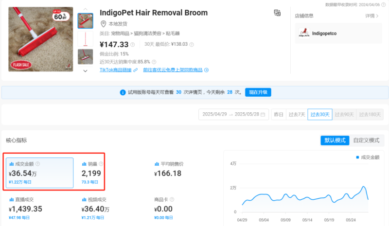 IndigoPetCo便是深耕寵物賽道的一大尖子生代表,作為一個專注于寵物清潔產(chǎn)品的品牌,近年來它在TikTok上逐漸嶄露頭角,特別是品牌旗下的王牌單品——除毛掃帚,更是讓其名聲大噪。根據(jù)Kalodata的數(shù)據(jù),該除毛掃帚近30天在TikTok平臺上賣出了超過2000件,累計(jì)銷售額為36.54萬。