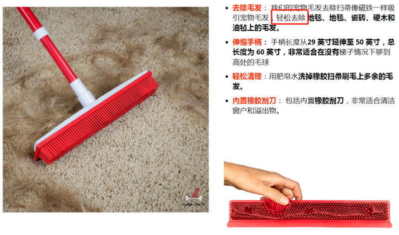 首先,它精準(zhǔn)地抓住了養(yǎng)寵家庭的痛點(diǎn)——寵物掉落的毛發(fā)難以徹底清理干凈。IndigoPetCo的除毛掃帚直擊這一痛點(diǎn),設(shè)計(jì)出了能夠深入地毯纖維、徹底清理寵物毛發(fā)的產(chǎn)品。掃帚上特殊的橡膠刷毛對寵物毛發(fā)具有較強(qiáng)的吸附力,在清掃過程中,毛發(fā)不易四處飛揚(yáng),清潔效率大大提高,打掃效果也是肉眼可見的好。?