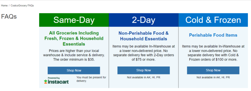 另一方面,Costco提供的送貨服務對購買的產品存在較多限制。比如當日送貨必須客戶當面簽收;兩日送貨只配送非易腐爛食品和家居必需品;冷凍服務專送易腐爛食品,但必然買夠100美元才能免運費。