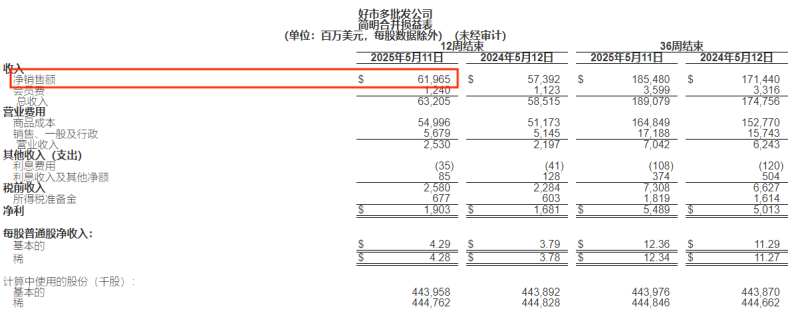 近日,Costco發布2025財年第三財季報告,截至2025年5月11日的前三個月,Costco凈銷售額達619.6億美元(約合4454.3億元),同比增長8%;凈利潤為19.0億美元(約合136.6億元),同比增長13%;攤薄后每股收益4.28美元,較預期高出0.04美元。