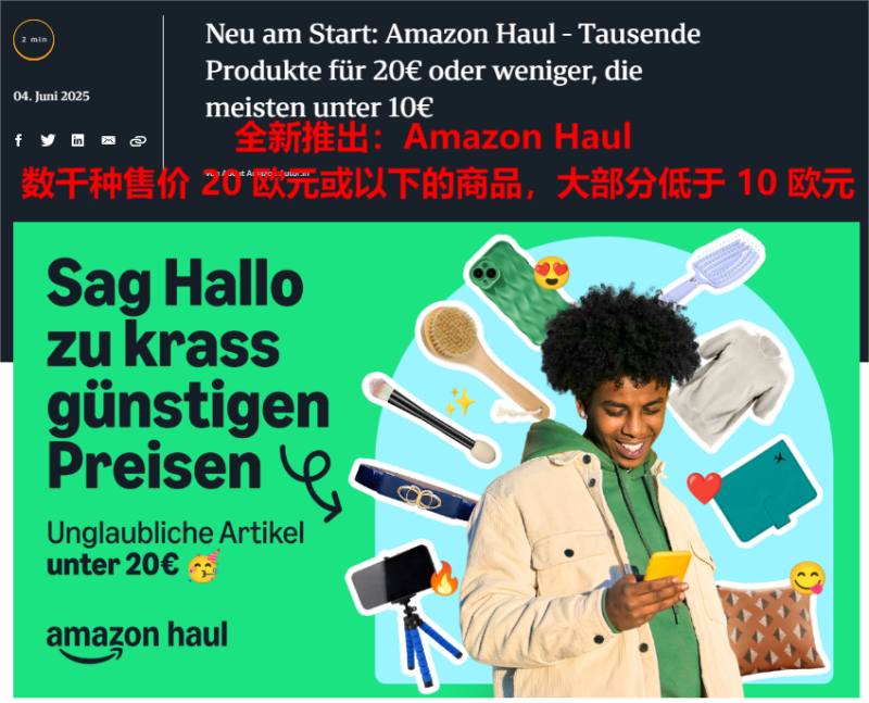近日,亞馬遜在德國站推出了低價商城Amazon Haul測試版,德國用戶可在亞馬遜購物應(yīng)用中,找到低價商城專區(qū),購買包括日常用品、時尚配飾、家居用品等在內(nèi)的數(shù)千種低價商品。
