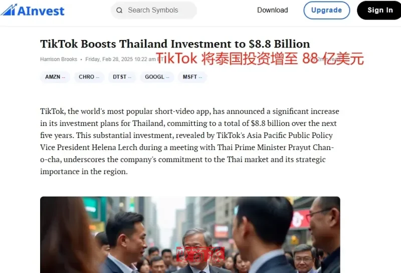 TikTok宣布在泰國投資88億美元 圖源:ainvest