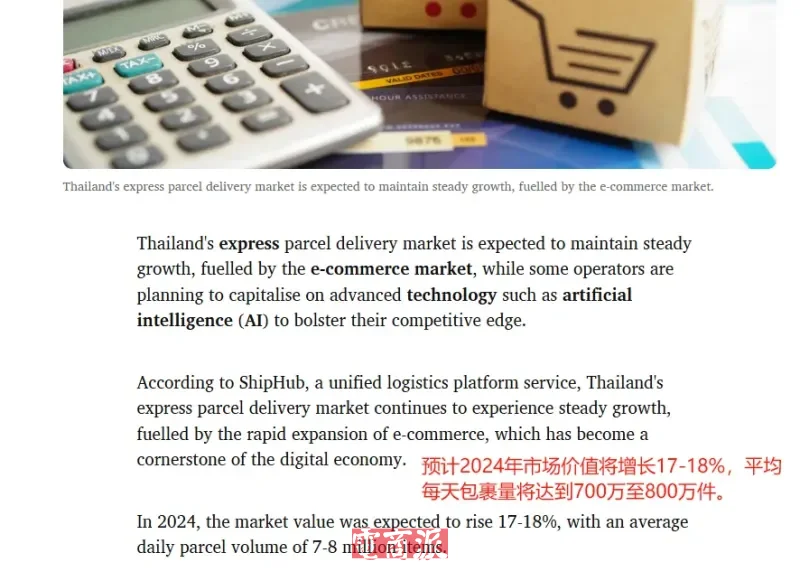 隨著電子商務快速擴張,以及AI人工智能技術不斷升級,泰國快遞包裹遞送市場迎來黃金增長期。