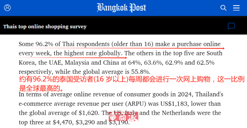 在泰國,網購已經成為人們日常生活不可或缺的一部分。根據We Are Social和Meltwater發布的報告,在全球網購、每周食品雜貨網購以及移動應用消費方面,泰國均位居前列。高達96.2%的受訪者每周至少進行一次在線購物,這一比例遠高于全球平均水平(55.8%)。