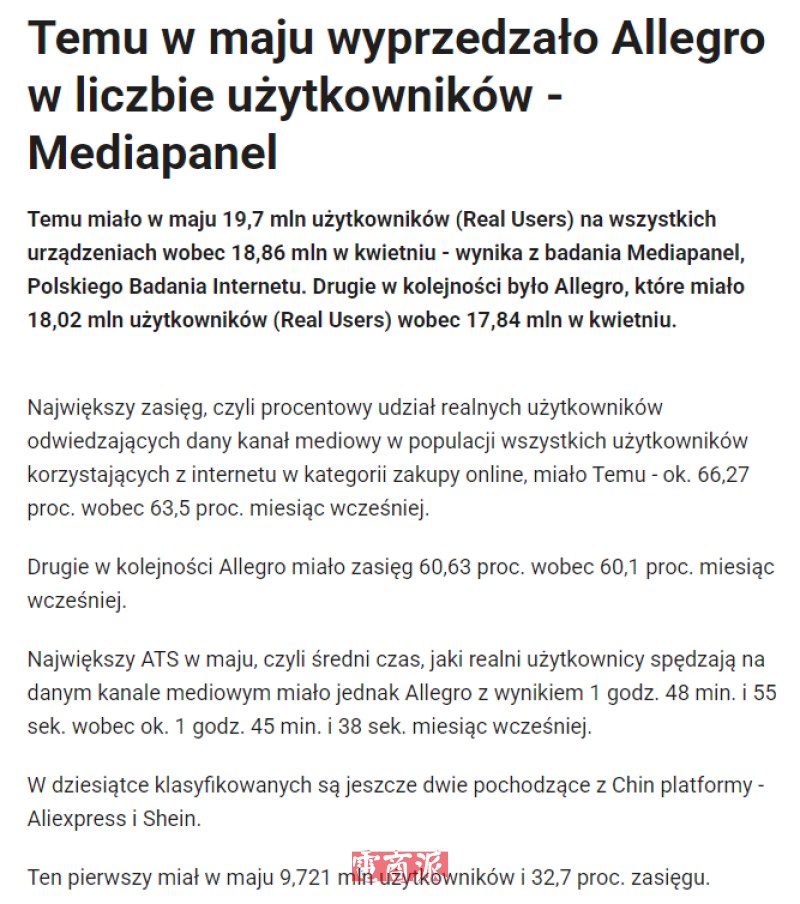 中國電商平臺在波蘭日益壯大的市場表現,正是其在整個歐洲電商版圖中加速布局的縮影。TEMU、速賣通和SHEIN等平臺通過提供價格低廉的商品、豐富的產品品類以及大規模的市場投放,正快速贏得歐洲消費者的青睞。其中,TEMU作為進入波蘭市場的“后來者”,其迅速崛起尤其引人注目。憑借“低價+全品類”的策略,該平臺在短時間內建立起龐大的用戶基礎,成功超越了長期主導波蘭市場的Allegro,凸顯其市場策略的高效與執行力。