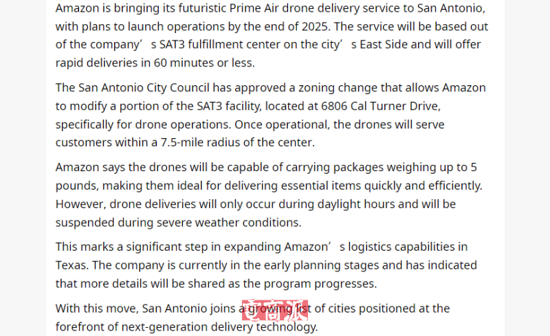 亞馬遜獲批在德州圣安東尼奧啟用無人機送貨