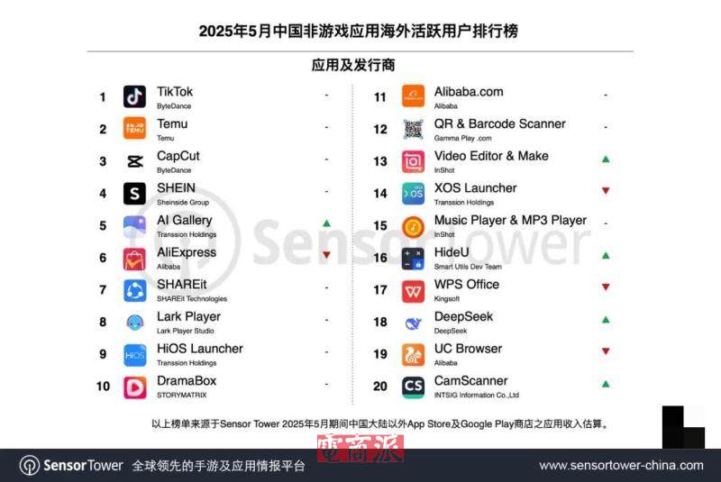 Sensor Tower最新數據顯示,2025年5月,中國非游戲類移動應用在全球市場持續展現出強勁的發展勢頭。短劇、電商、AI工具三大主力賽道繼續高歌猛進,拉美、東南亞成為增長熱土。其中,短視頻領域依舊是TikTok占據頭名,移動端海外月活躍用戶首次突破10億大關;CapCut單月下載量穩定在3300萬次左右。TikTok+CapCut的生態協同效應正在不斷放大,構建起內容創作閉環。