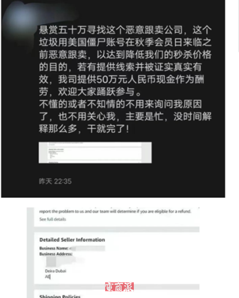 2023年亞馬遜Prime會員日到來之際,廣東一大賣就不幸被同行坑了一手,對方利用僵尸賬號在會員日來臨之前進行惡意跟賣,導致其大促秒殺價格被壓低,該大賣對此深惡痛絕,表示愿意懸賞50萬人民幣尋找這家惡意跟賣的公司。
