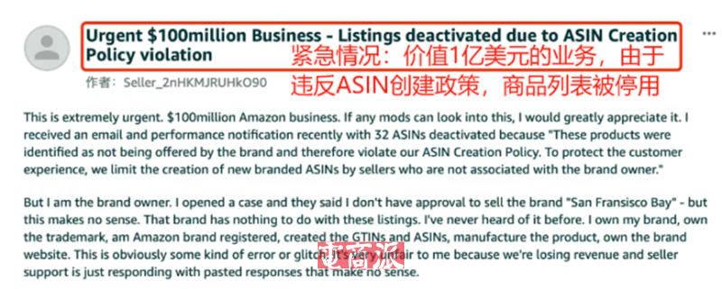 消息顯示,近日,一位亞馬遜食品類目大賣(以下簡稱賣家A)在賣家論壇上發帖求助,稱其賬號產品疑似因為違反ASIN創建政策被封,涉及業務價值一億美金,走投無路的他只能向其他賣家求助。