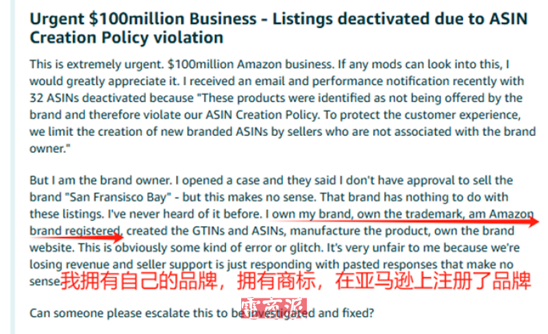 具體來說,賣家A在帖子中表示,他最近突然收到了一份亞馬遜官方的電子郵件和績效通知,提示其銷售的產品未經過品牌方的授權,因為違反了亞馬遜ASIN創建的規則。為了保護客戶體驗和品牌方權益,亞馬遜限制與品牌所有者無關的賣家新創建未授權品牌相關的ASIN,導致賣家A店鋪32個ASIN被集體停用。