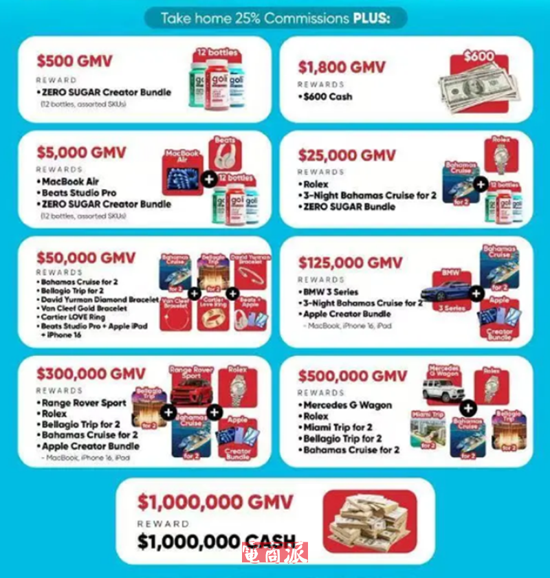其中,首獎GMV門檻相當(dāng)?shù)停灰翯MV達(dá)到500美金就能獲得12罐Goli Nutrition軟糖,很多達(dá)人都能達(dá)標(biāo)。月GMV超過1800美元之后,獎勵就會不斷疊加,如果能突破500000美元,達(dá)人便能得到一輛梅賽德斯豪車和一款勞力士豪表,以及邁阿密、意大利貝拉吉奧、巴哈馬三地的雙人旅行套餐。