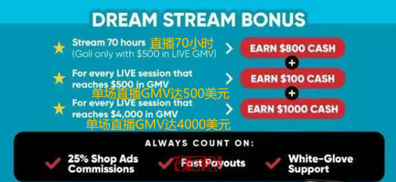 據(jù)了解,Goli Nutrition規(guī)定,達(dá)人直播70小時以上并產(chǎn)生500美元以上的Goli銷售金額,可獲得800美元;每場GMV超過500美元的直播,都將獎勵100美元現(xiàn)金;單場直播超過4000美元時,達(dá)人便可以得到1000美金的現(xiàn)金獎勵。
