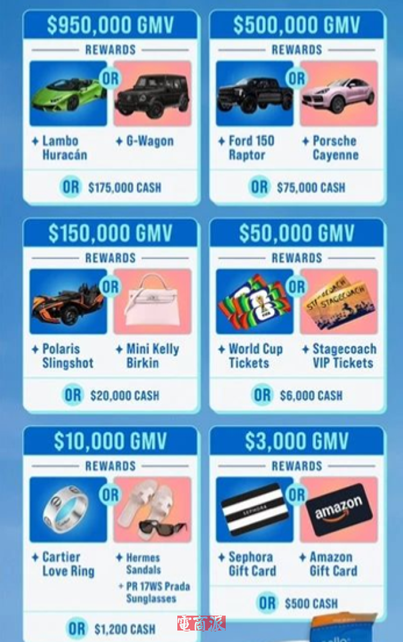 此外,當(dāng)達(dá)人GMV達(dá)到100萬美金及以上,他/她還將獲得最高獎勵——100萬美元現(xiàn)金。