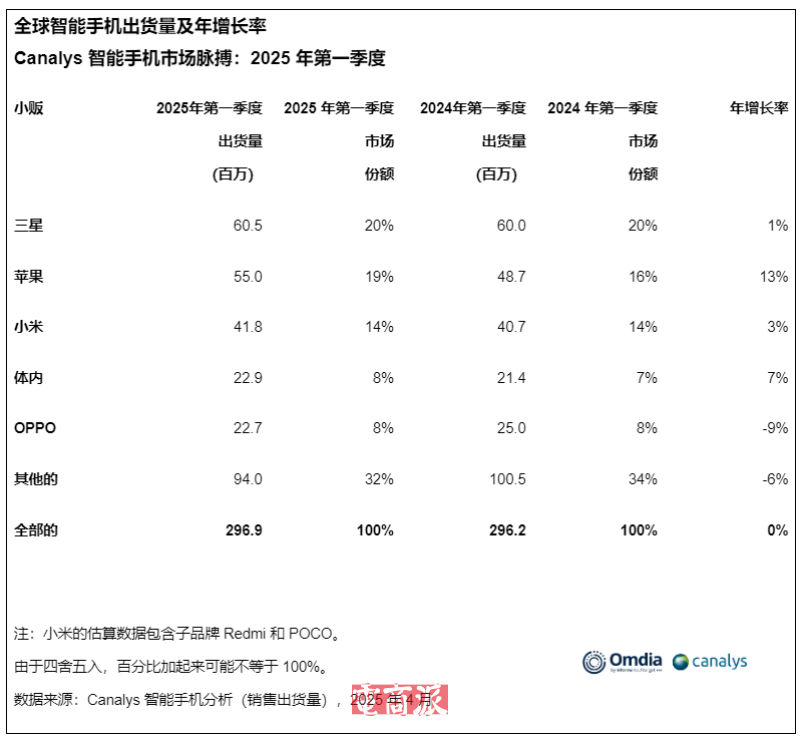根據Canalys最新數據,今年一季度,小米手機以4180萬臺的出貨量和14%的市場份額,繼續保持全球手機供應商前三,僅次于蘋果和三星。