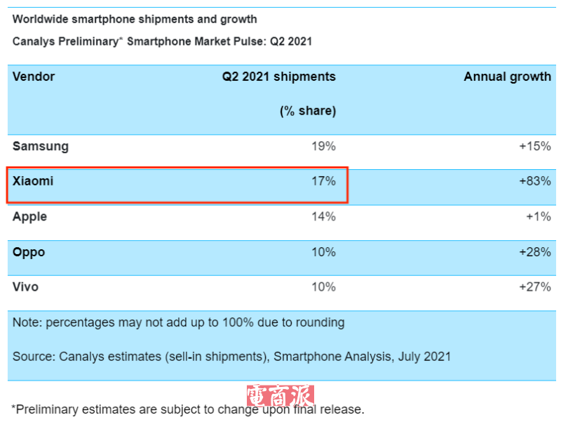 全球技術市場分析公司Canalys的數據顯示,2021年第二季度,小米手機首次超越蘋果,成為全球第二大智能手機供應商。雖然很快被蘋果反超,但對小米而言,這無疑是一次重要的階段性突破。