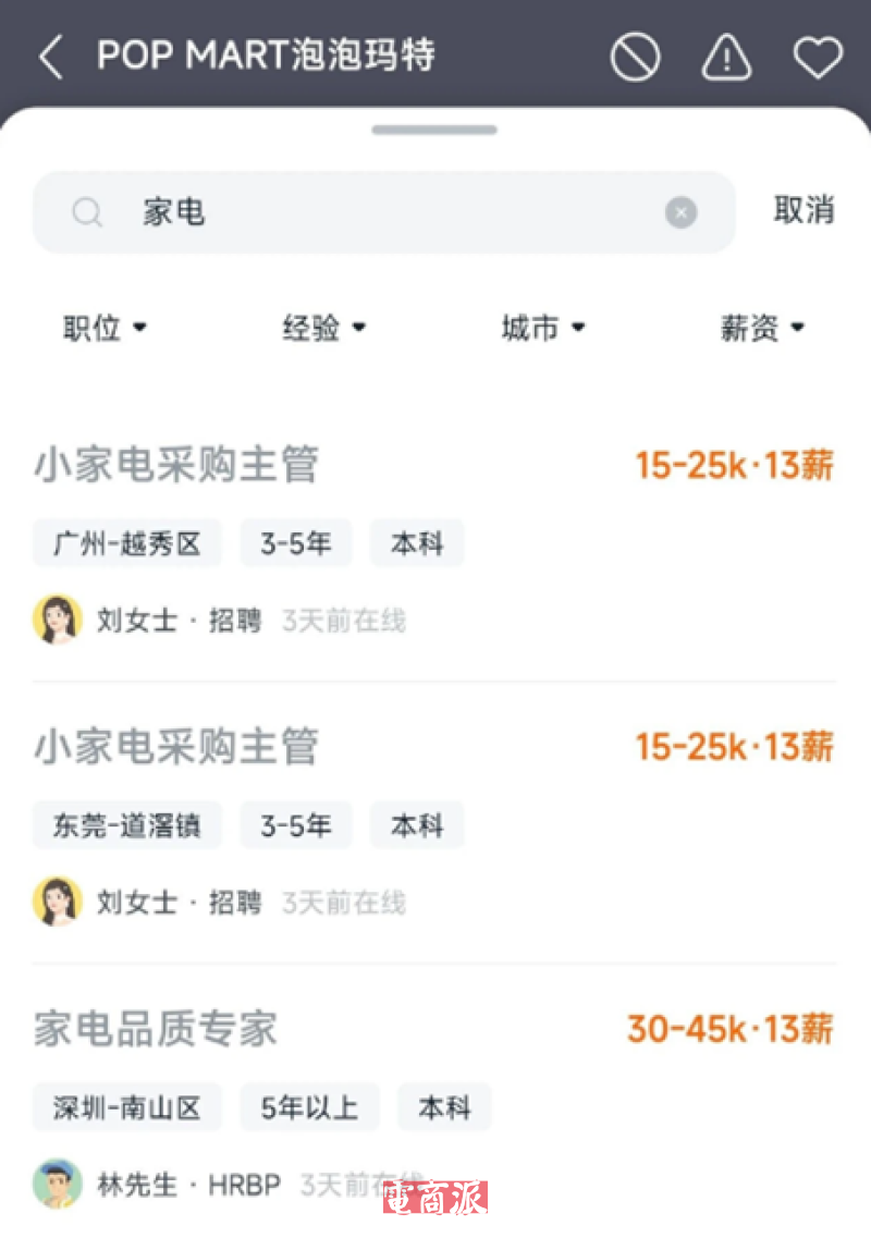 泡泡瑪特招聘家電領(lǐng)域人才 圖源:Boss直聘