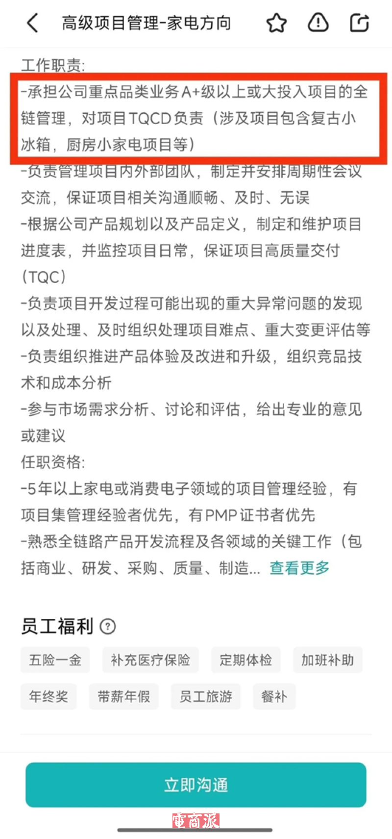 以高級項(xiàng)目管理-家電方向?yàn)槔搷徫灰笥小?/span>5年以上家電或消費(fèi)電子領(lǐng)域的項(xiàng)目管理經(jīng)驗(yàn)”,同時“熟悉全鏈路產(chǎn)品開發(fā)流程及各領(lǐng)域的關(guān)鍵工作”,入職后的相關(guān)工作則是承擔(dān)重點(diǎn)品類業(yè)務(wù)A+級以上或大投入項(xiàng)目的全周期管理。除此之外,一些崗位也標(biāo)明需要冰箱、咖啡機(jī)、早餐機(jī)、電水壺等品類的研發(fā)或供應(yīng)鏈經(jīng)驗(yàn)。